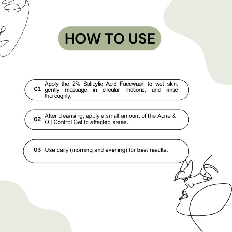 - Step 1 – Cleanse: Apply the 2% Salicylic Acid Facewash to wet skin, gently massage in circular motions, and rinse thoroughly.