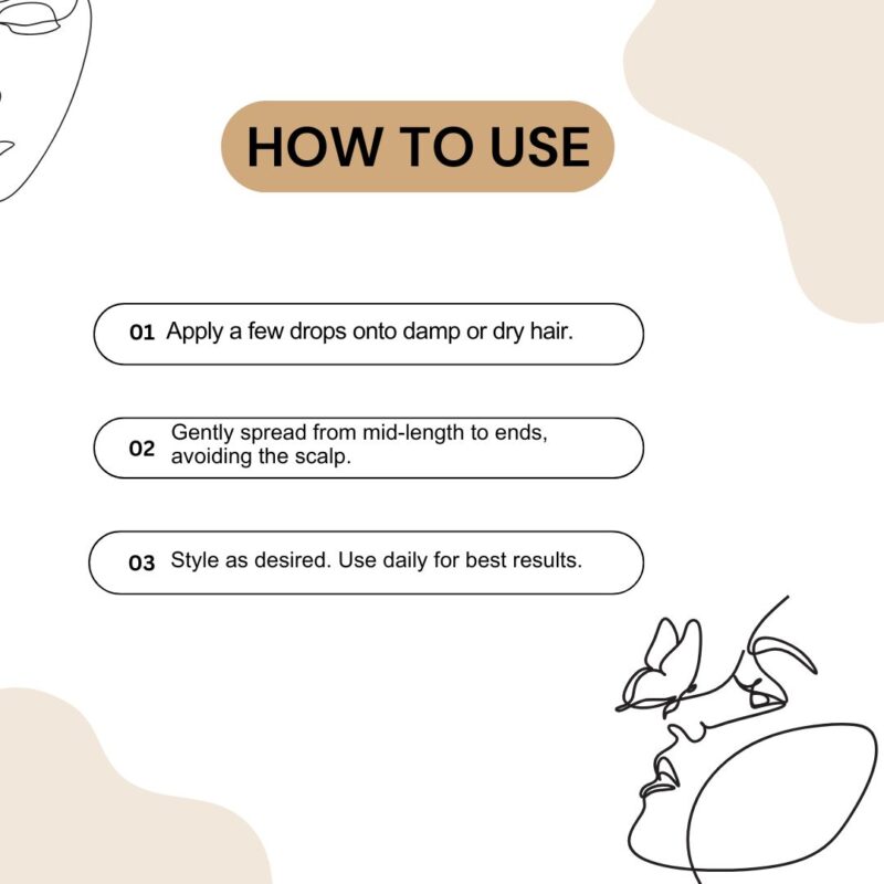 - Apply a few drops onto damp or dry hair.