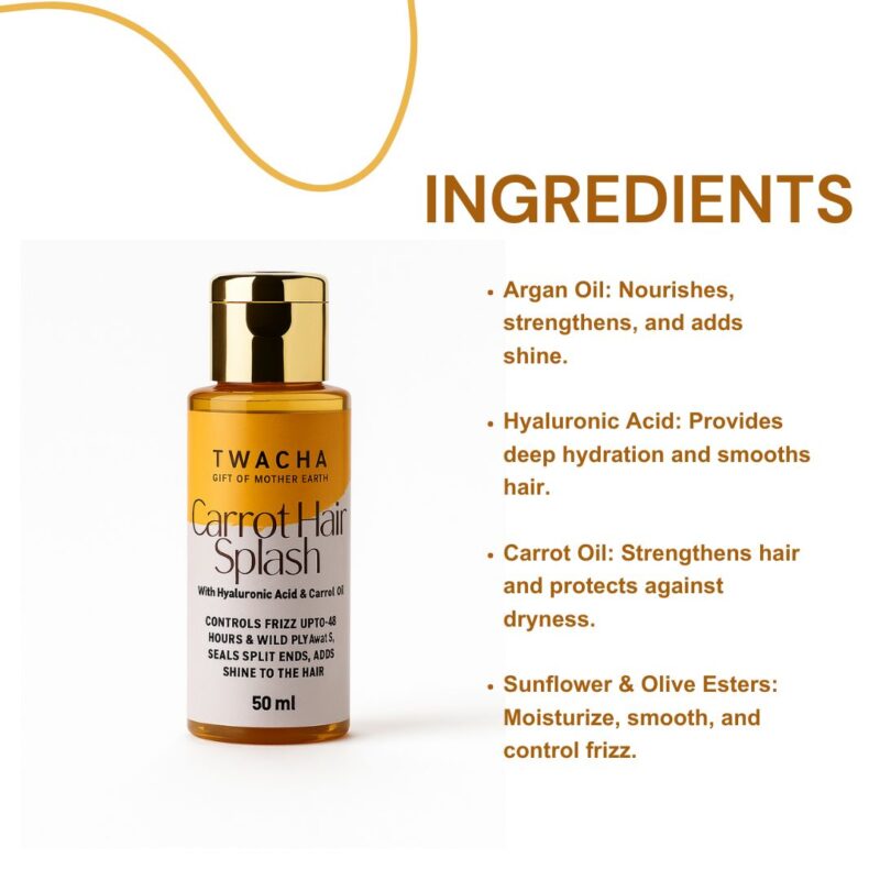 Smooth, Shiny, and Frizz-Free Hair Tame frizz, flyaways, and split ends with Twaura by Ayesha’s Carrot Hair Splash, a lightweight, silicone-free hair serum designed to smooth, moisturize, and add shine to your hair without heavy chemicals like sulfates or silicones. Infused with Hyaluronic Acid, Carrot Oil, Argan Oil, and natural esters, this serum nourishes your strands while keeping them manageable for up to 48 hours. Perfect for all hair types, it helps control frizz, seal split ends, and enhance your hair’s natural shine. A little goes a long way for soft, smooth, and revitalized hair.