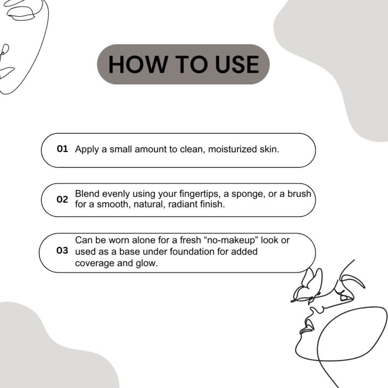 - Can be worn alone for a fresh “no-makeup” look or used as a base under foundation for added coverage and glow.