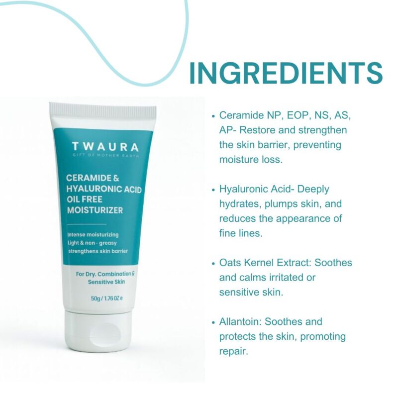 Experience lightweight, lasting hydration with Twaura’s Hyaluronic Acid & Ceramide Oil-Free Moisturizer.