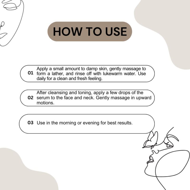 • 20% Vitamin C Serum: After cleansing and toning, apply a few drops of the serum to the face and neck. Gently massage in upward motions. Use in the morning or evening for best results.