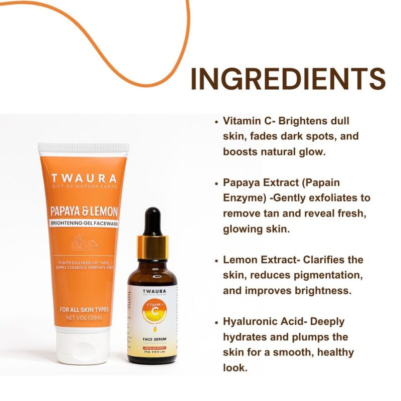 Daily Glow Duo Papaya Lemon Facewash & 20% Vitamin C Serum is a skincare duo designed to brighten, hydrate, and rejuvenate the skin, providing a glowing complexion. Rich in enzymes like papain, it helps gently exfoliate and remove dead skin cells, leaving the skin smoother and brighter. This high-potency serum absorbs quickly into the skin, delivering a surge of brightening and anti-aging benefits. It improves overall skin texture and provides a youthful glow.