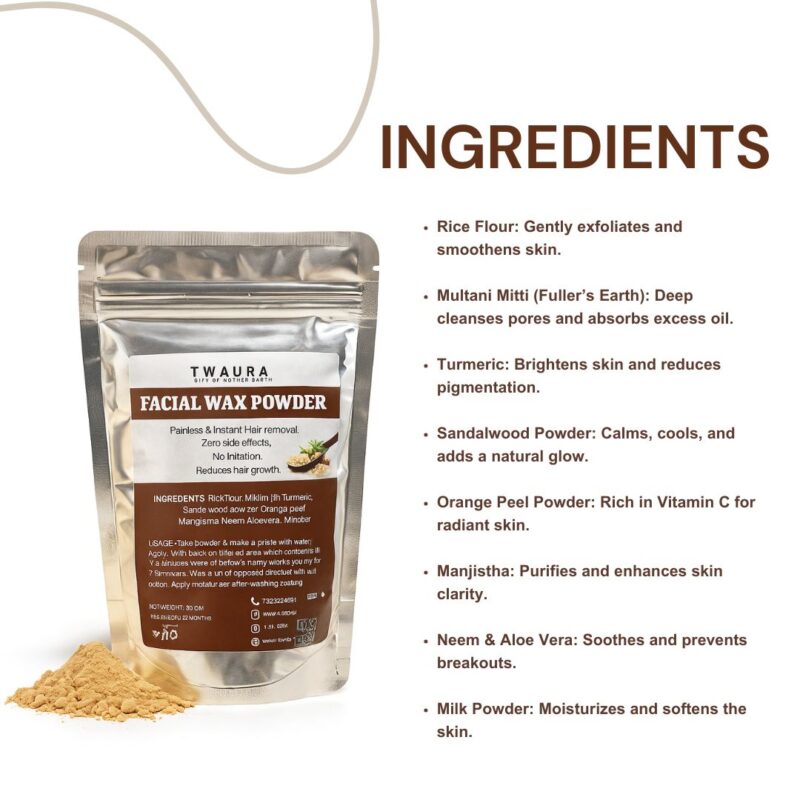 Experience smooth, glowing, and hair-free skin with TWAURA Facial Wax Powder, a gentle herbal formulation designed for painless and instant hair removal. Crafted with traditional Ayurvedic ingredients like Rice Flour, Multani Mitti, Turmeric, and Sandalwood, this powder not only removes unwanted hair but also soothes, brightens, and nourishes your skin. Unlike chemical waxes or harsh hair removal creams, Twaura’s natural blend ensures zero irritation, no side effects, and reduced hair regrowth over time. Perfect for maintaining soft, radiant, and clean skin — naturally.