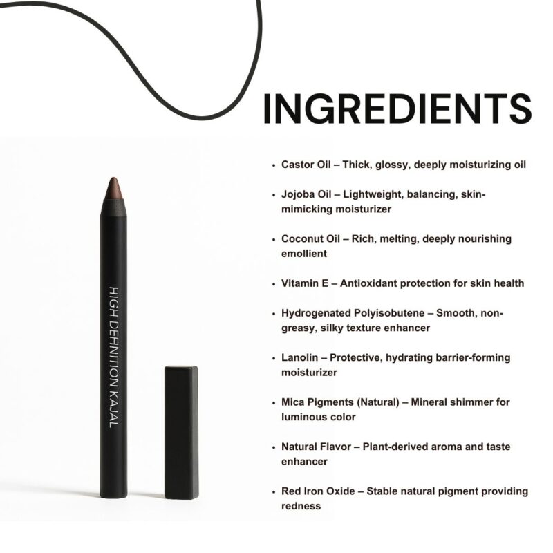 Formulated with high-definition pigments, this kajal delivers rich, ultra-black color that glides on smoothly and effortlessly. Its creamy texture allows for seamless application, whether you’re creating a subtle daytime look or a dramatic smokey eye. Waterproof and long-lasting, our HD Kajal ensures that your eye makeup stays flawless all day and night. Elevate your beauty routine and make a statement with eyes that mesmerize with our HD Kajal.