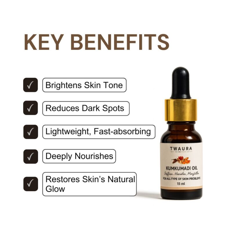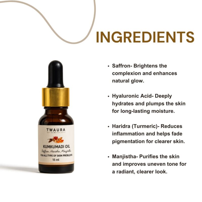 Experience the ancient luxury of Ayurveda with Twaura’s Kumkumadi Oil, a revered beauty elixir crafted from a blend of precious herbs and pure oils, including Saffron (Kesar), Manjistha, and Haridra (Turmeric).