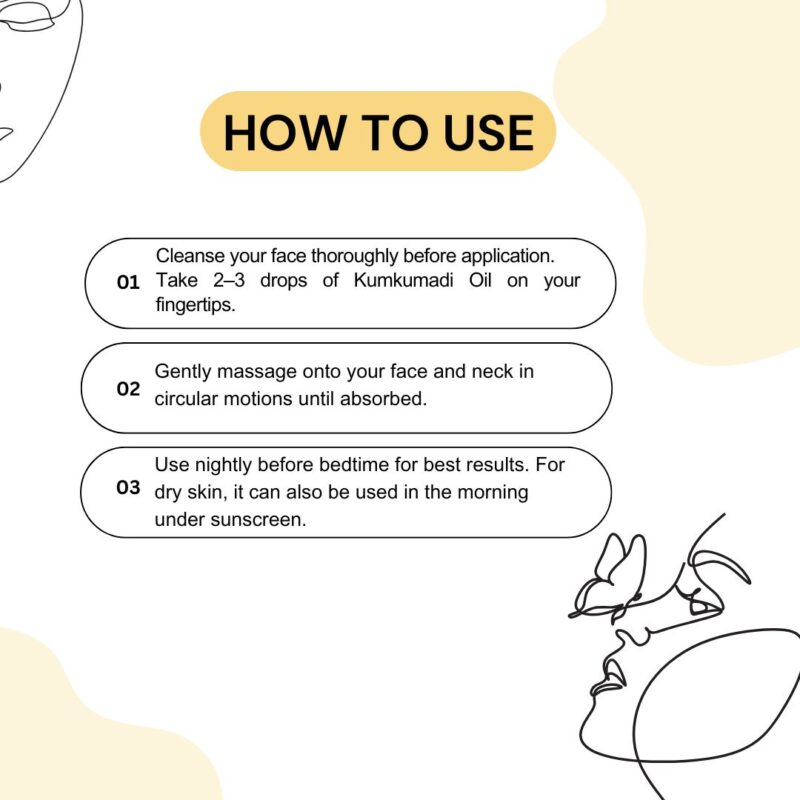 - Take 2–3 drops of Kumkumadi Oil on your fingertips.