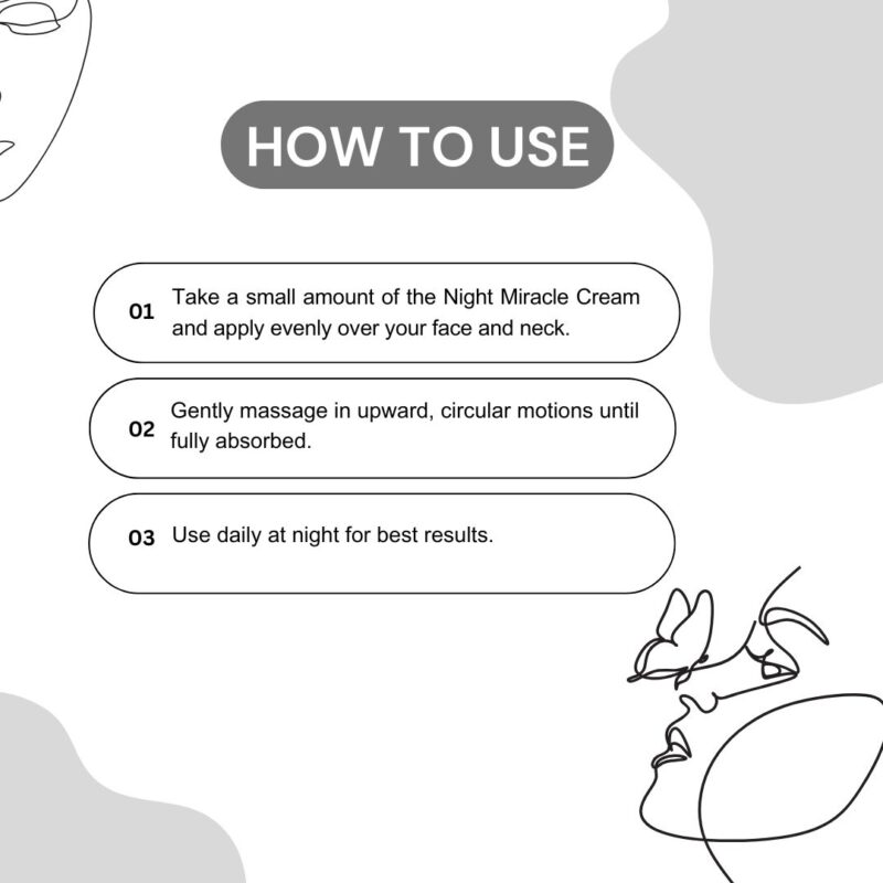 - Apply: Take a desired amount of the Night Miracle Cream and apply evenly over your face and neck in a thin layer. Leave it overnight. Do not massage or rub.Next morning wash your face with gentle facewash.