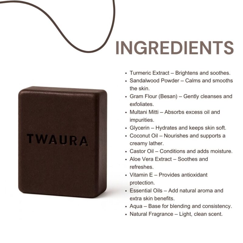 Turmeric Extract, Sandalwood Powder, Gram Flour (Besan), Multani Mitti, Glycerin, Coconut Oil, Castor Oil, Aloe Vera Extract, Vitamin E, Essential Oils, Aqua, and Natural Fragrance.