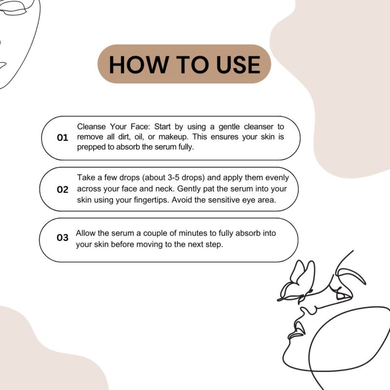 - Apply the Serum: Take 3–5 drops and apply evenly over your face and neck, gently patting it in. Avoid the eye area.