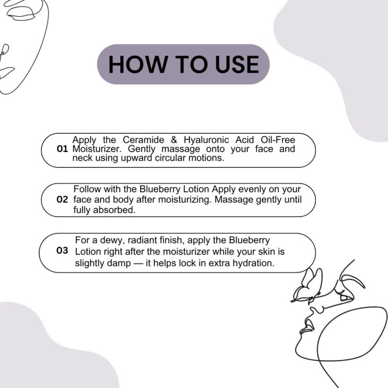 Step 2: Apply the Ceramide & Hyaluronic Acid Oil-Free Moisturizer- Take a small amount of moisturizer. Gently massage onto your face and neck using upward circular motions. Allow it to absorb completely before layering any additional products or makeup. Use twice daily — morning and night — for best results.